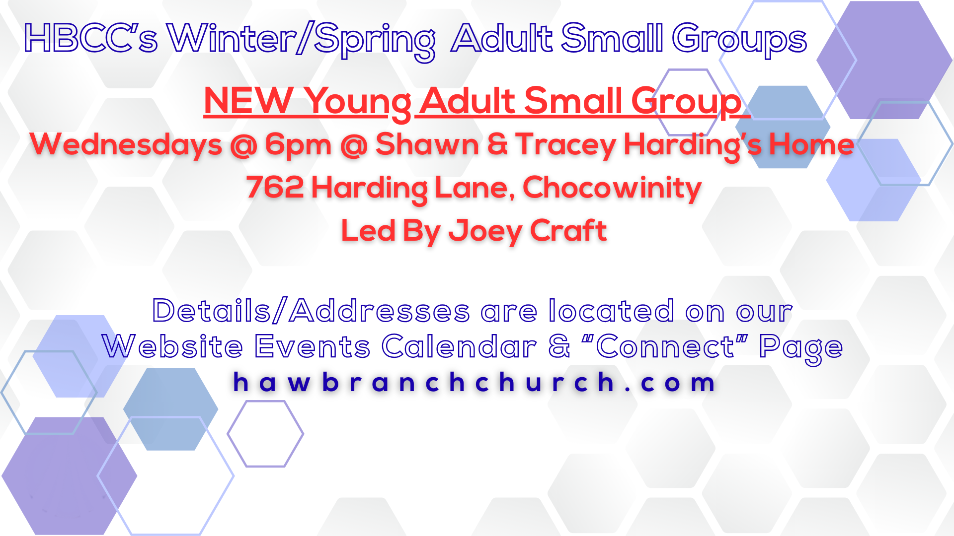 Monday Night Adult Small Group: Current Study: TBA Mondays @ 7pm @ Austin & Amanda Proffitt's Home (childcare not available) Led by Shawn Yates (252-944-6291)-text or call for the address…